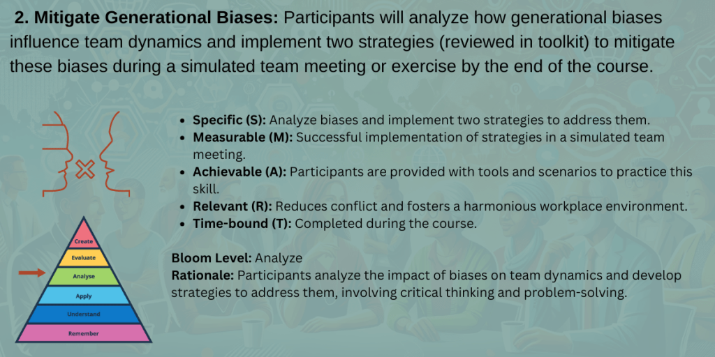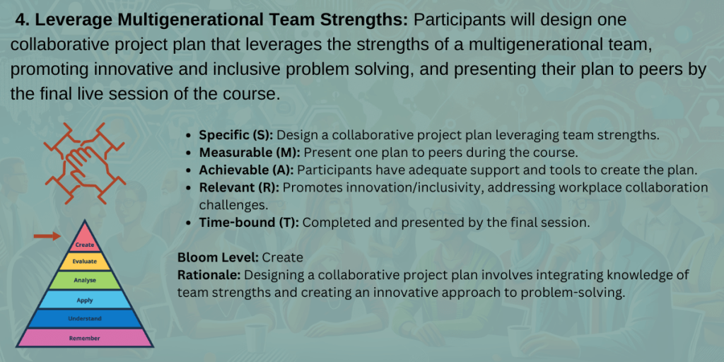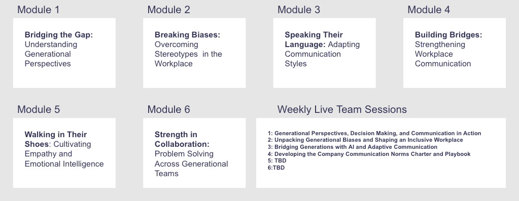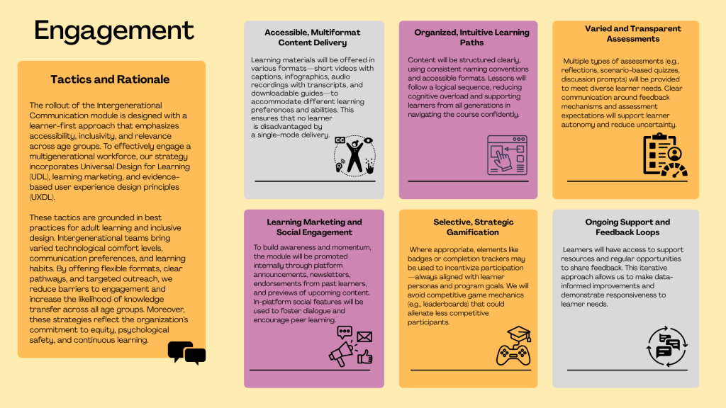 These engagement tactics are grounded in best practices for adult learning and inclusive design. Intergenerational teams bring varied technological comfort levels, communication preferences, and learning habits. By offering flexible formats, clear pathways, and targeted outreach, we reduce barriers to engagement and increase the likelihood of knowledge transfer across all age groups.