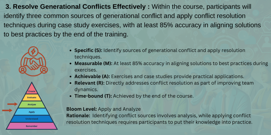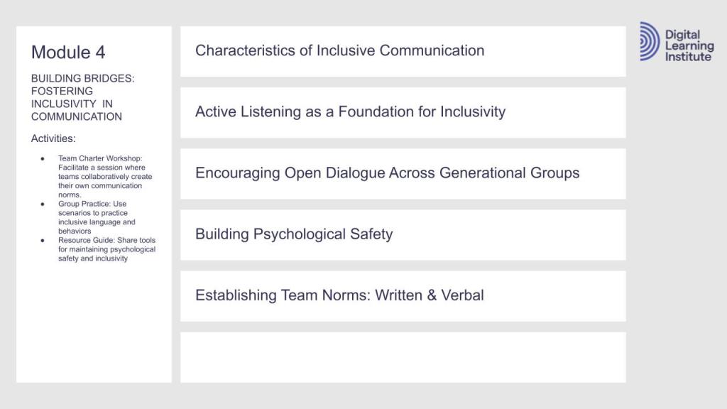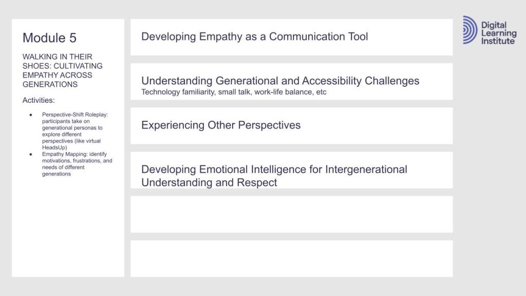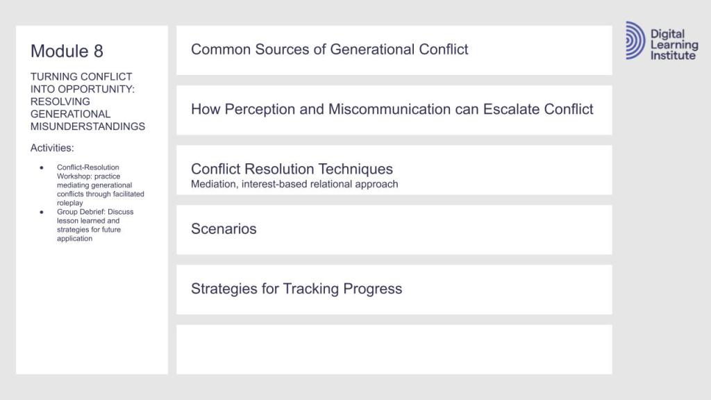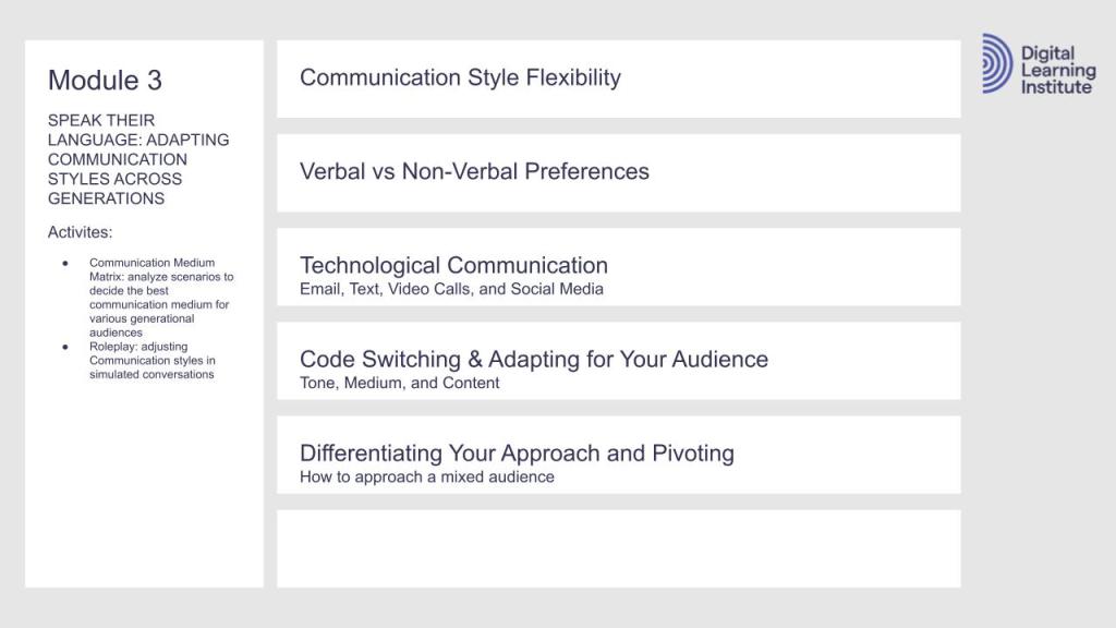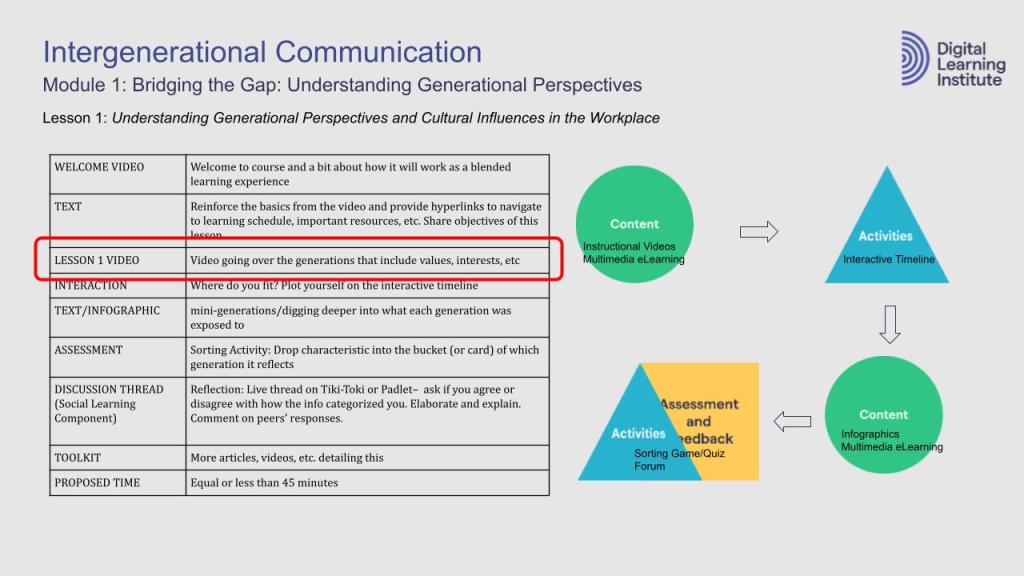Each module in my course plan on Intergenerational Communication calls for videos, infographics, multimedia eLearning packages, virtual or in-person classrooms, and social learning forums.
