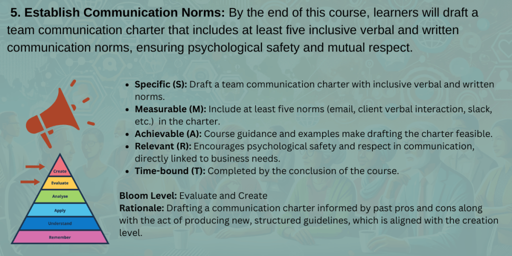 Turning the learning outcomes into SMART goals was pretty easy because I am quite experienced in that area. I’m excited to get to the design phase where I can create the activities that help my learners demonstrate/provide evidence of each step from Bloom’s Taxonomy.
