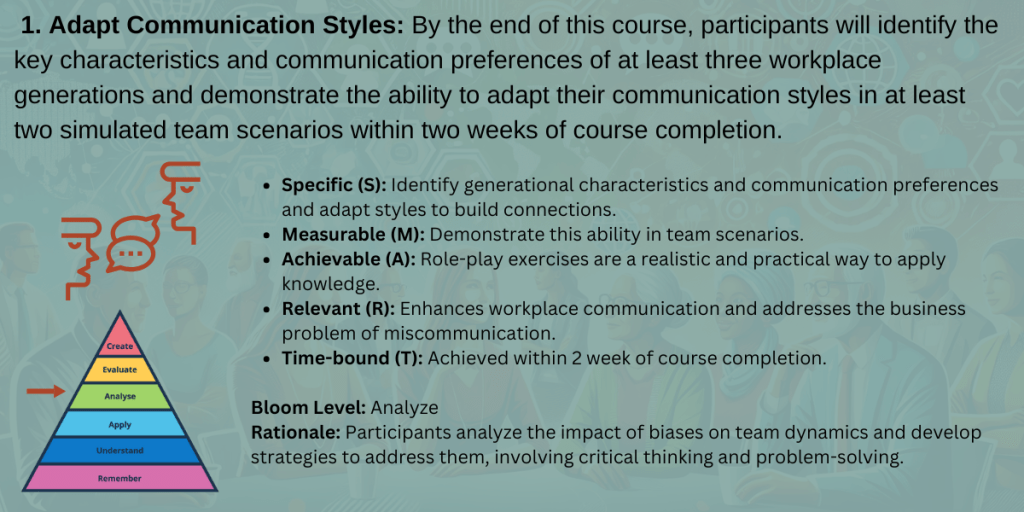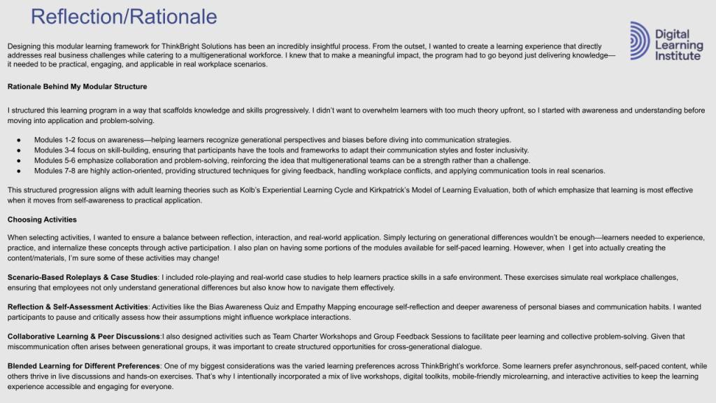Choosing 360Learning directly supports the original SMART goals and addresses the core business and learning gaps identified during the design phase of this module. The platform’s collaborative features—including in-line comments, peer feedback, and scenario-based discussion prompts—create opportunities for real-time dialogue across generations, helping to reduce miscommunication and build empathy among team members. By supporting multiple content formats and learner-driven pacing, 360Learning ensures that employees of all generations can engage with the material in ways that reflect their communication styles and comfort levels, directly aligning with our goal of increasing adaptation strategies and mutual understanding. Additionally, the ability to track learner engagement and performance allows us to measure progress toward our 90% mastery target on key communication principles, while the flexibility to assign custom learning paths ensures content remains relevant to each learner’s role and generational lens. Ultimately, 360Learning acts not just as a delivery tool, but as a dynamic learning environment that reinforces our culture of open communication, psychological safety, and cross-generational collaboration.