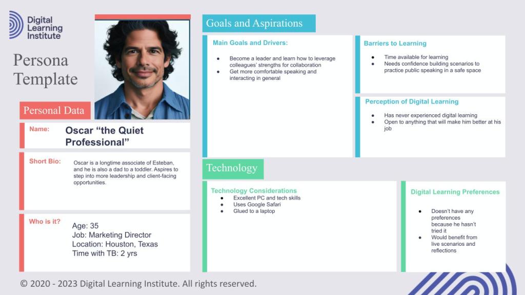 LEARNING PREFERENCES: Based on the personas, the content should be organized into short modules to accommodate busy schedules. Multimedia elements will engage these learners, and they will benefit from practical examples and case studies from the marketing industry.