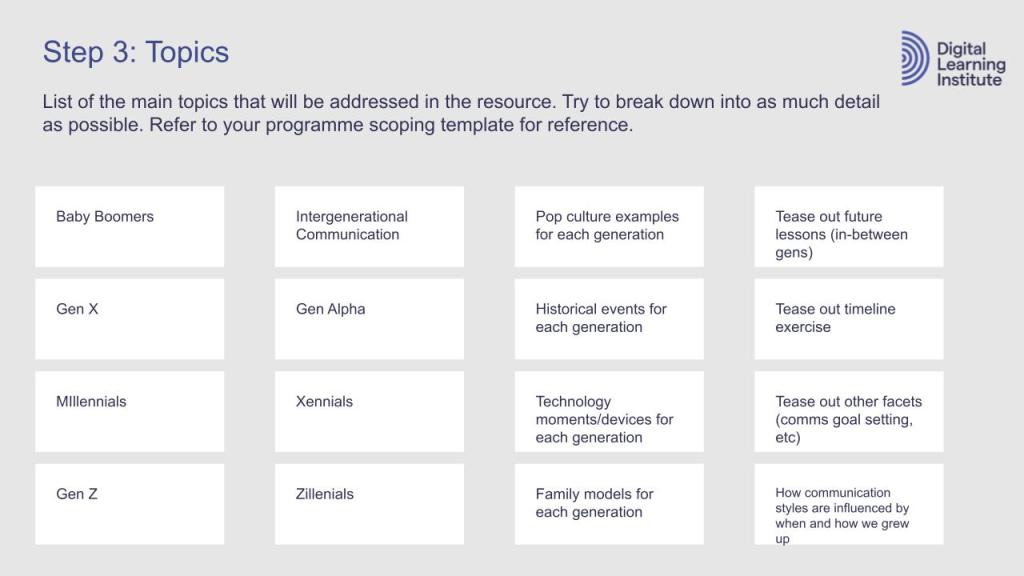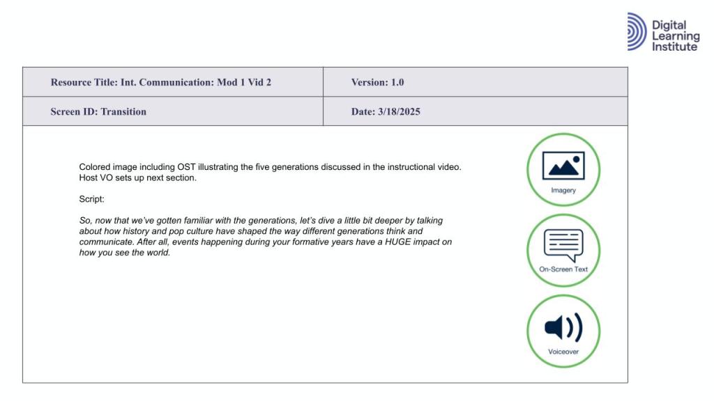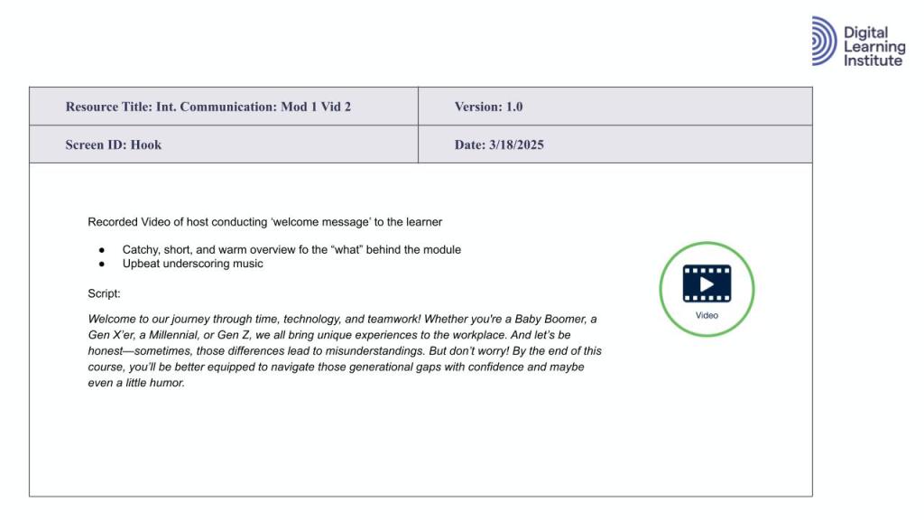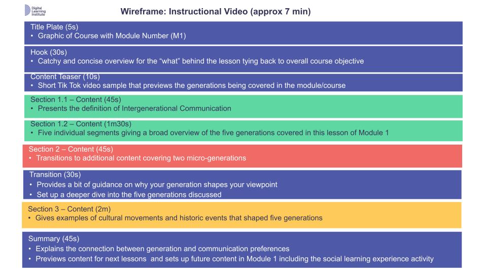 In this section, I will dive into presenting the micro design and development of a single learning resource component, inside of an individual lesson, inside of a single Module (Module 1 to be exact), inside of the the entire 6-module course on Intergenerational Communication. This will include scoping documents and a prototype for that selected sample learning resource.