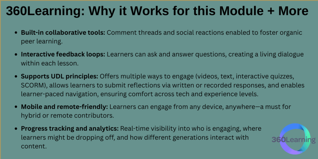 I feel like deciding on a course authoring software was more difficult that deciding on an LMS– especially when I wasn’t able to try them out ahead of time. However, after evaluating several LMS options for my intergenerational communication module at this particular company, I selected 360Learning because it strikes the right balance between collaboration, inclusivity, and ease of use—all critical for a small, dynamic marketing team. This module is designed to spark dialogue between generations, encourage reflection across age and role divides, and foster mutual understanding in the workplace. To achieve these goals, I needed a platform that supports real-time peer interaction, aligns with Universal Design for Learning (UDL), utilizes necessary functionalities, and scales with the closely knit team if they to grow or be acquired by a larger company.