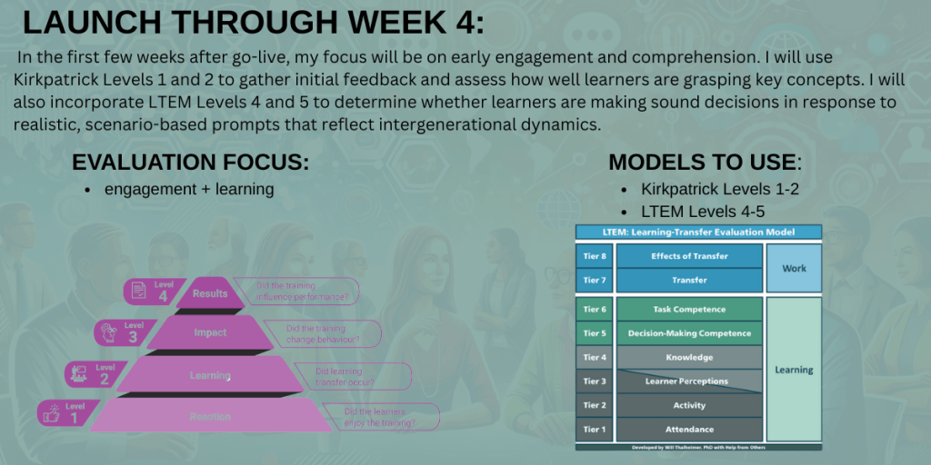 To evaluate the effectiveness of my Intergenerational Communication module, I will use a blended and phased approach, drawing from multiple learning evaluation models at different points in the rollout. Rather than relying on a single framework, I will match each model to specific stages of implementation—beginning before launch and continuing well after learners complete the course.